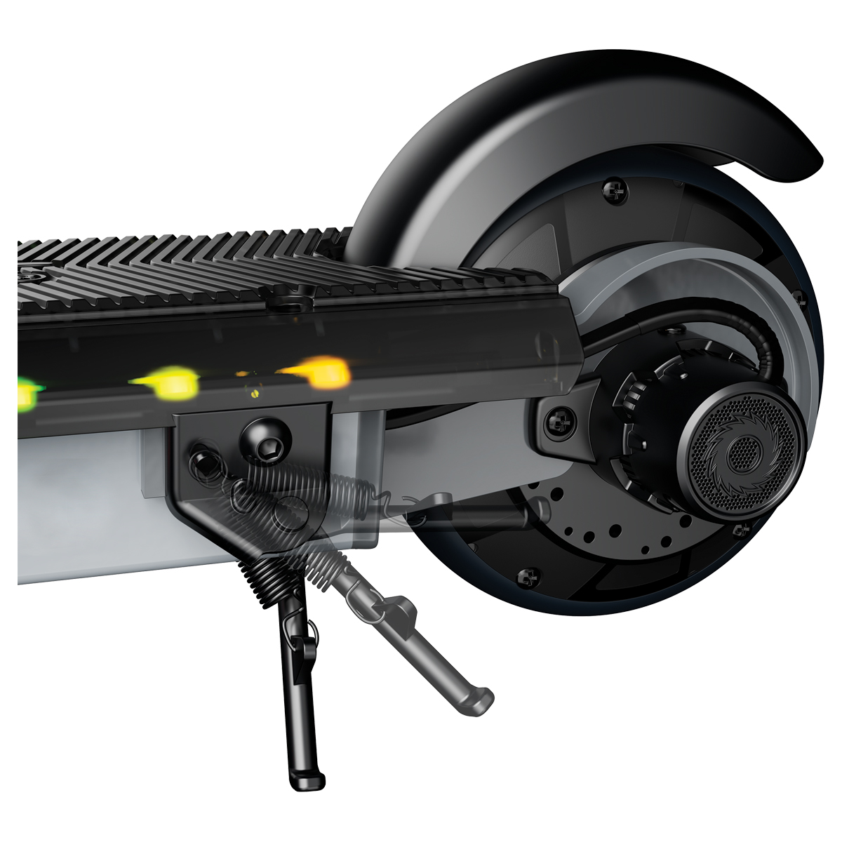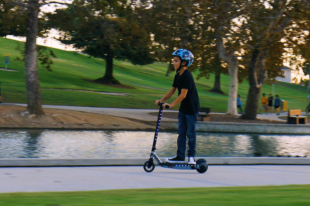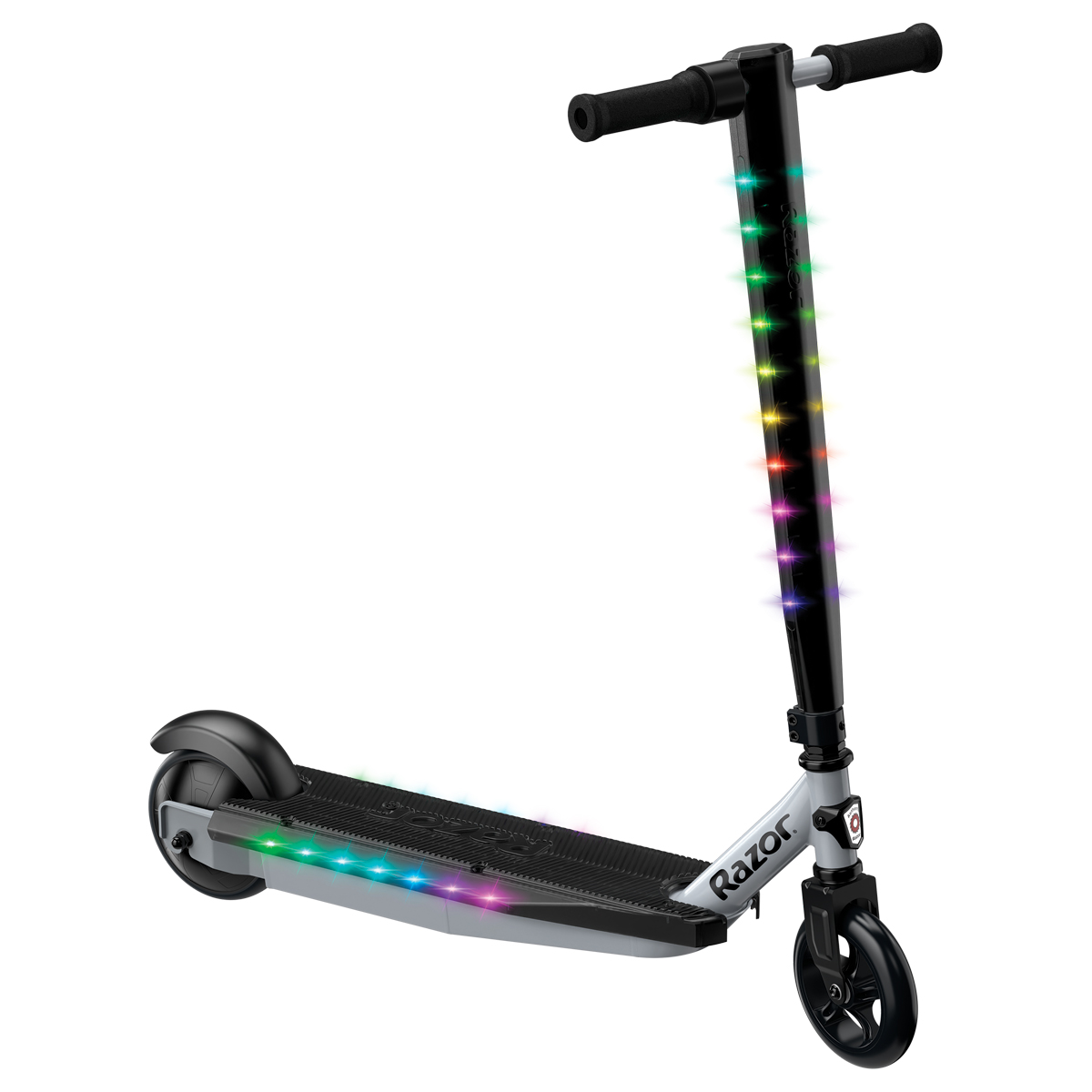 Powering on the product using the ON/OFF switch will activate the multi-color LED lights embedded along both sides of the deck and steering tube.