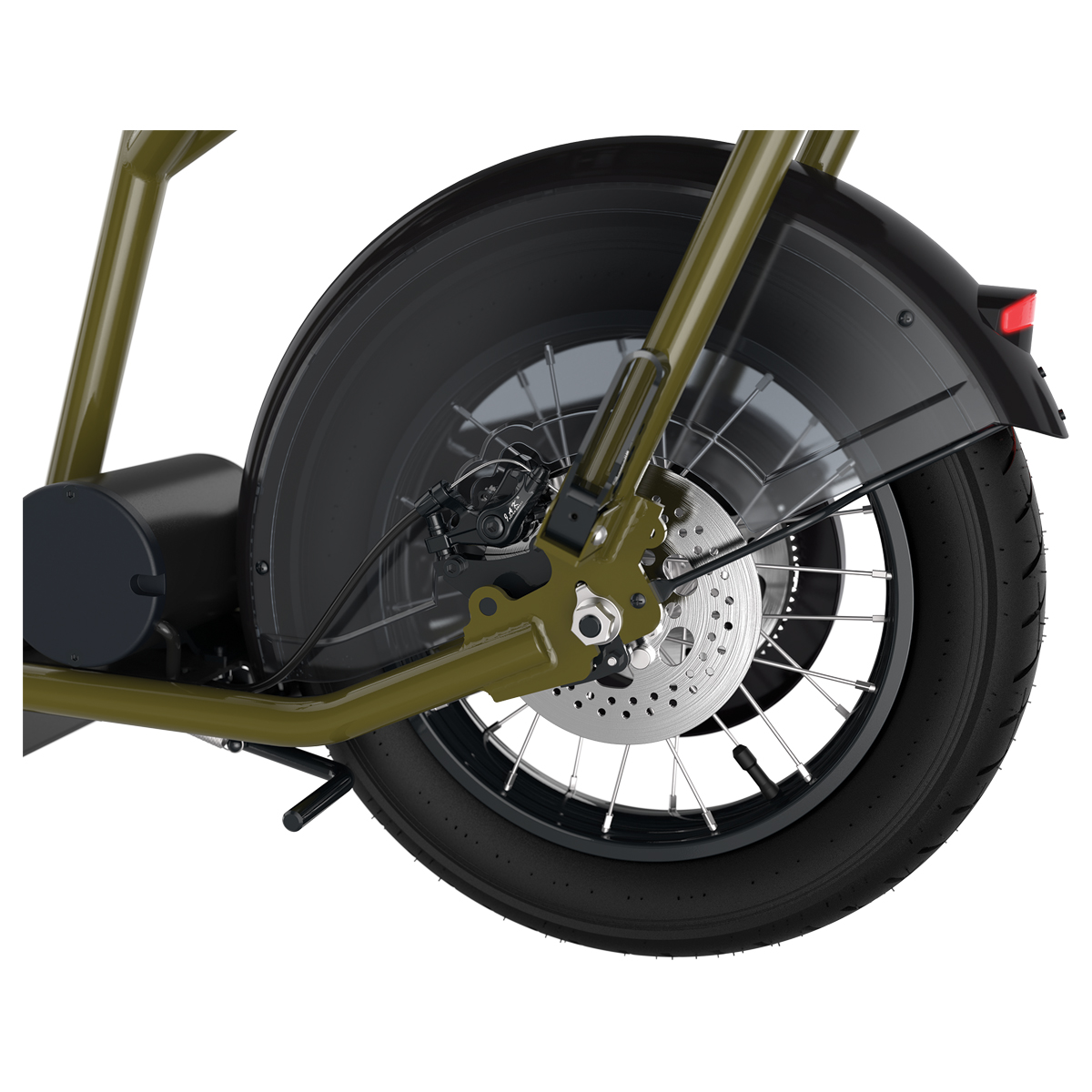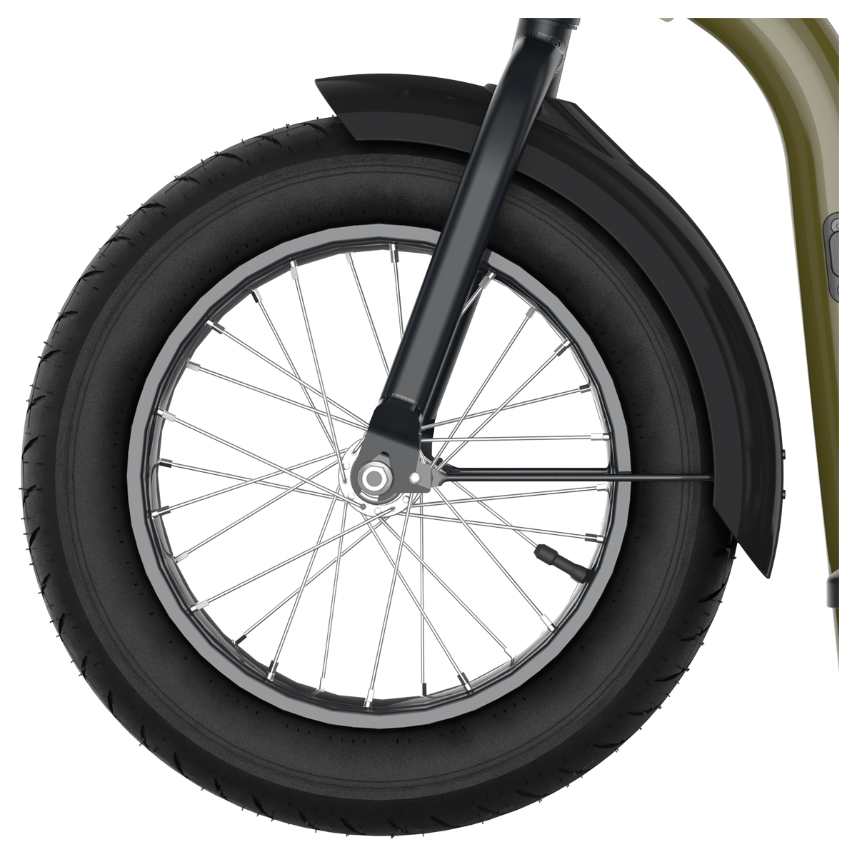 - Wheels: Spoked, 16″ (406 mm) with superwide pneumatic tires