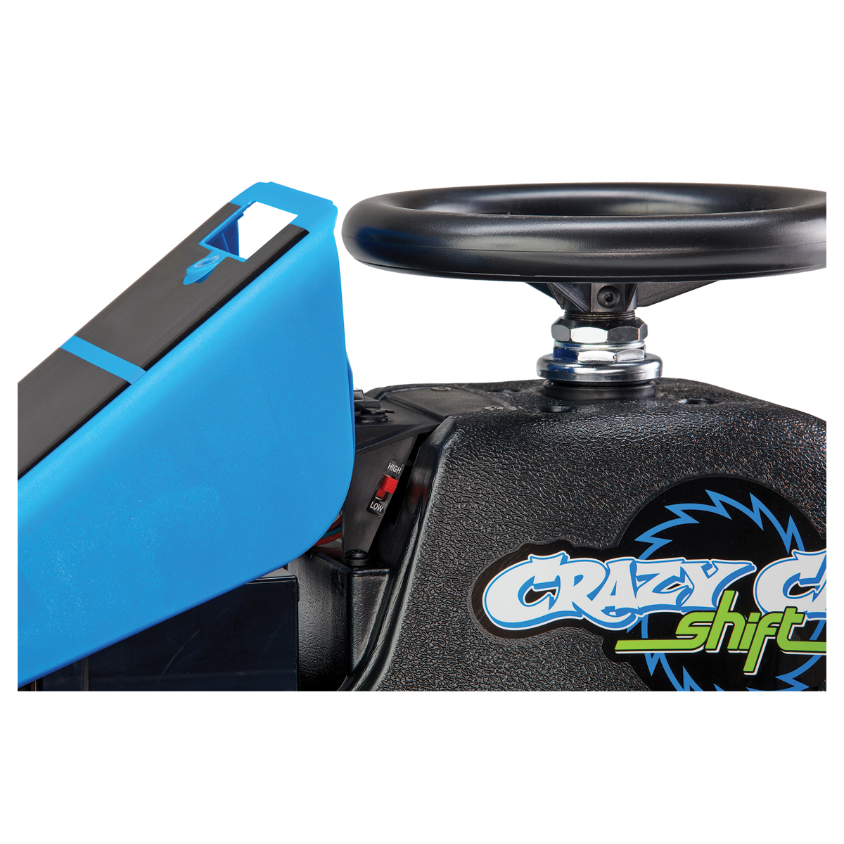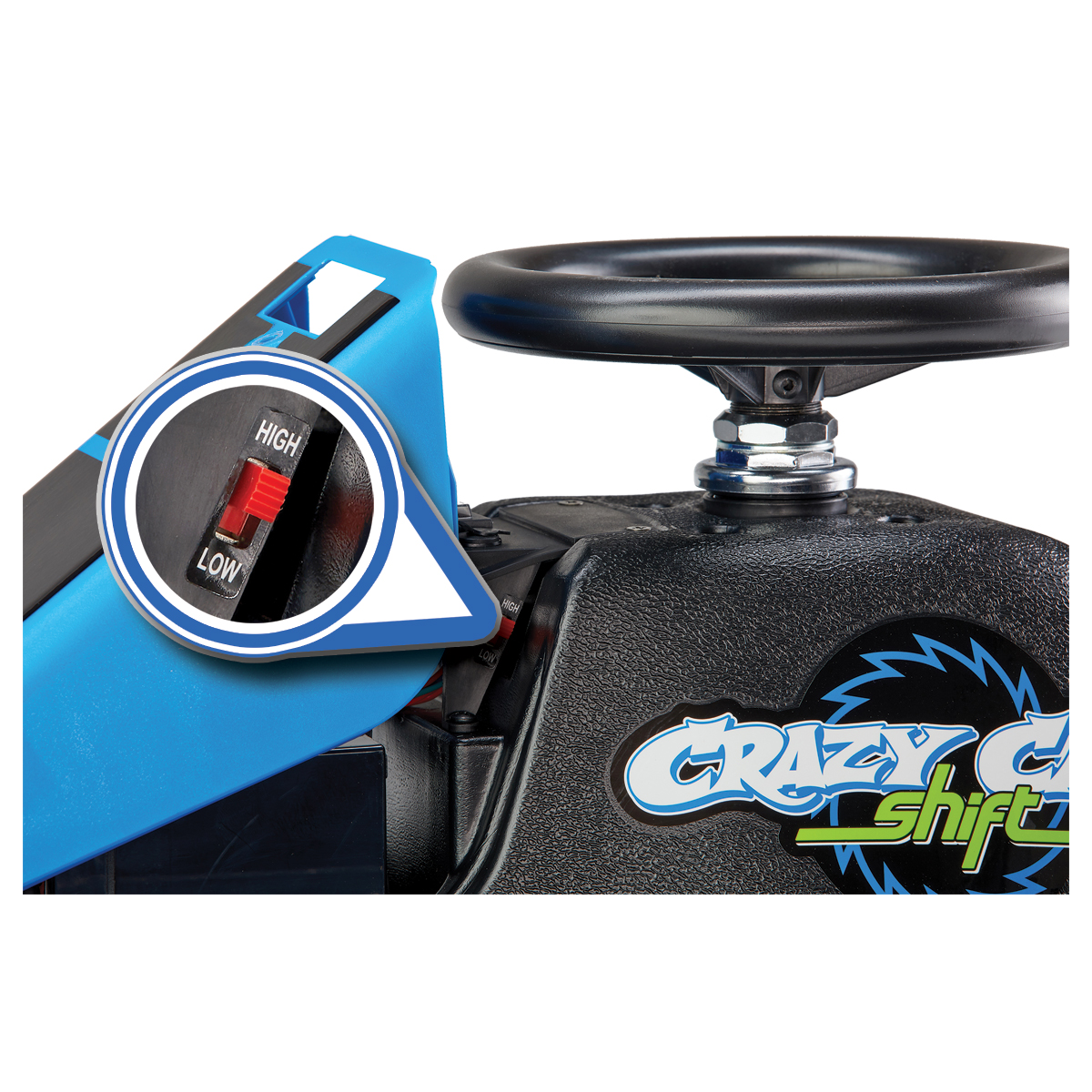A hidden top speed control switch allows parents to select the appropriate maximum speed for their child: 2.5 mph (4 km/h) for beginners and younger drivers or 8 mph (13 km/h) for the full Crazy Cart Shift experience.