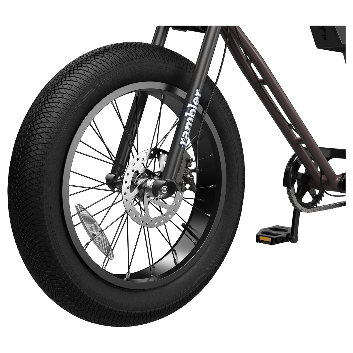 Built with high-quality steel frame and 20” (508 mm) x 4” (101.6 mm) pneumatic balloon tires, this retro-style electric bike will make cruising over rough terrain a smooth and comfortable experience.