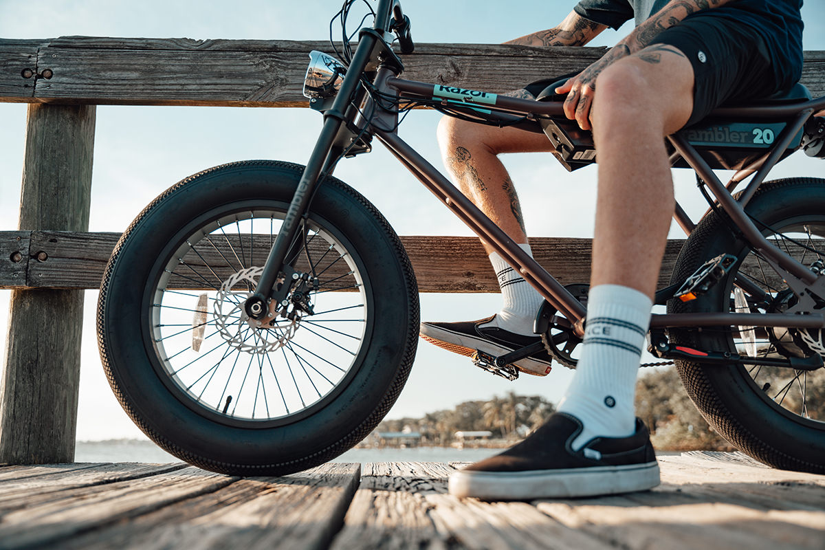 - Features 20” (508 mm) x 4” (101.6 mm) pneumatic balloon tires, hand-operated front and rear disc brakes, bright LED headlight and taillight, and a dashboard display