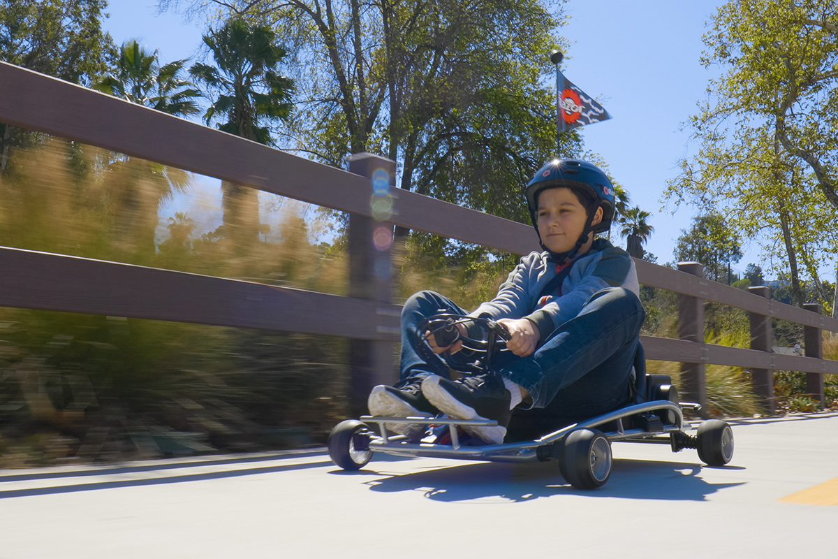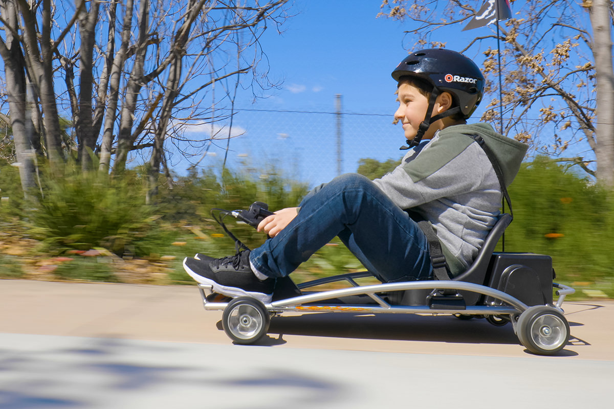 Designed for zipping around flat trails or a cul-de-sac (local laws apply), this electric go-kart features rubber tires with molded aluminum rims, bucket-style seat with shoulder strap, hand-operated rear brake, and rechargeable 24-volt battery system that delivers up to 40 minutes of continuous run time.