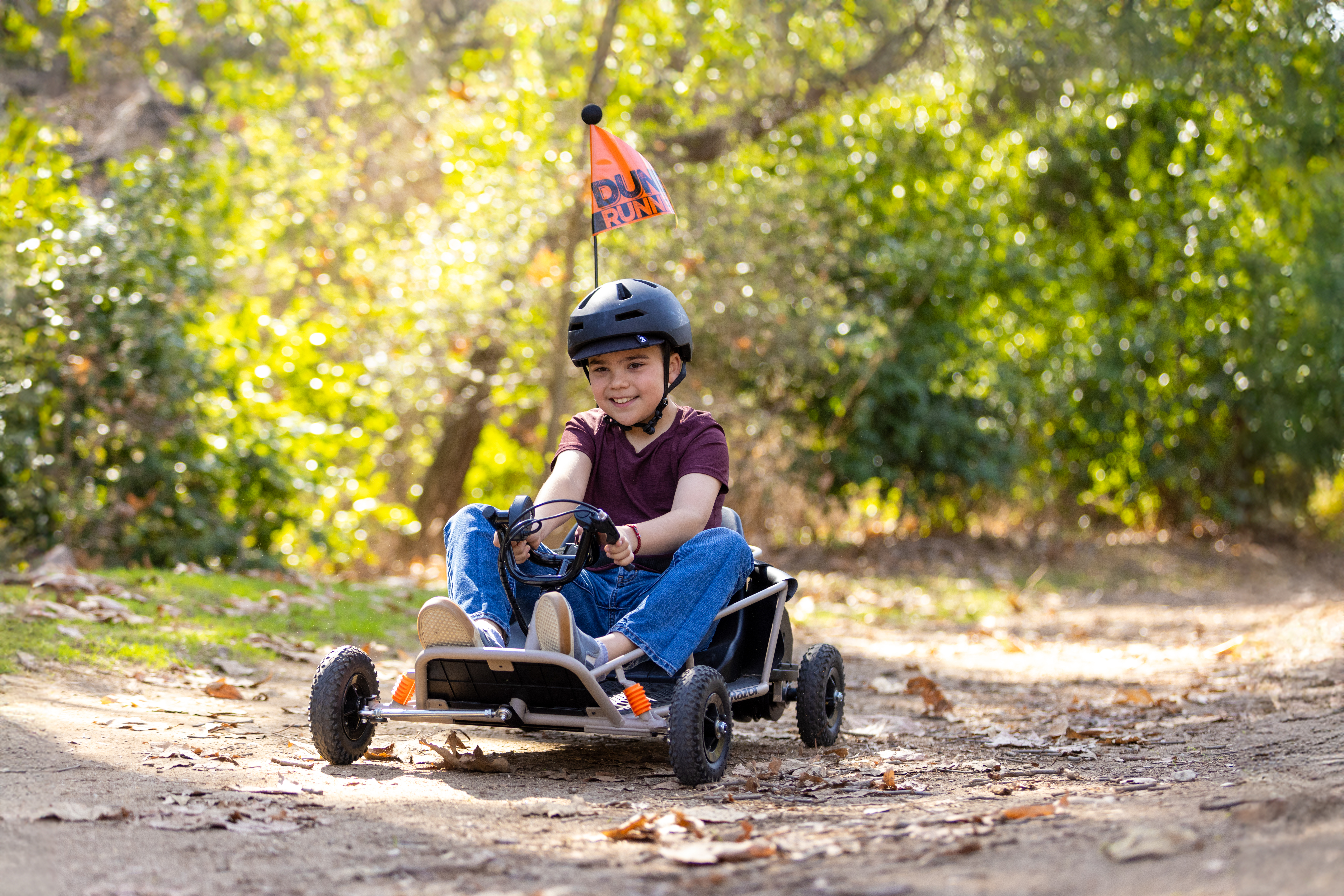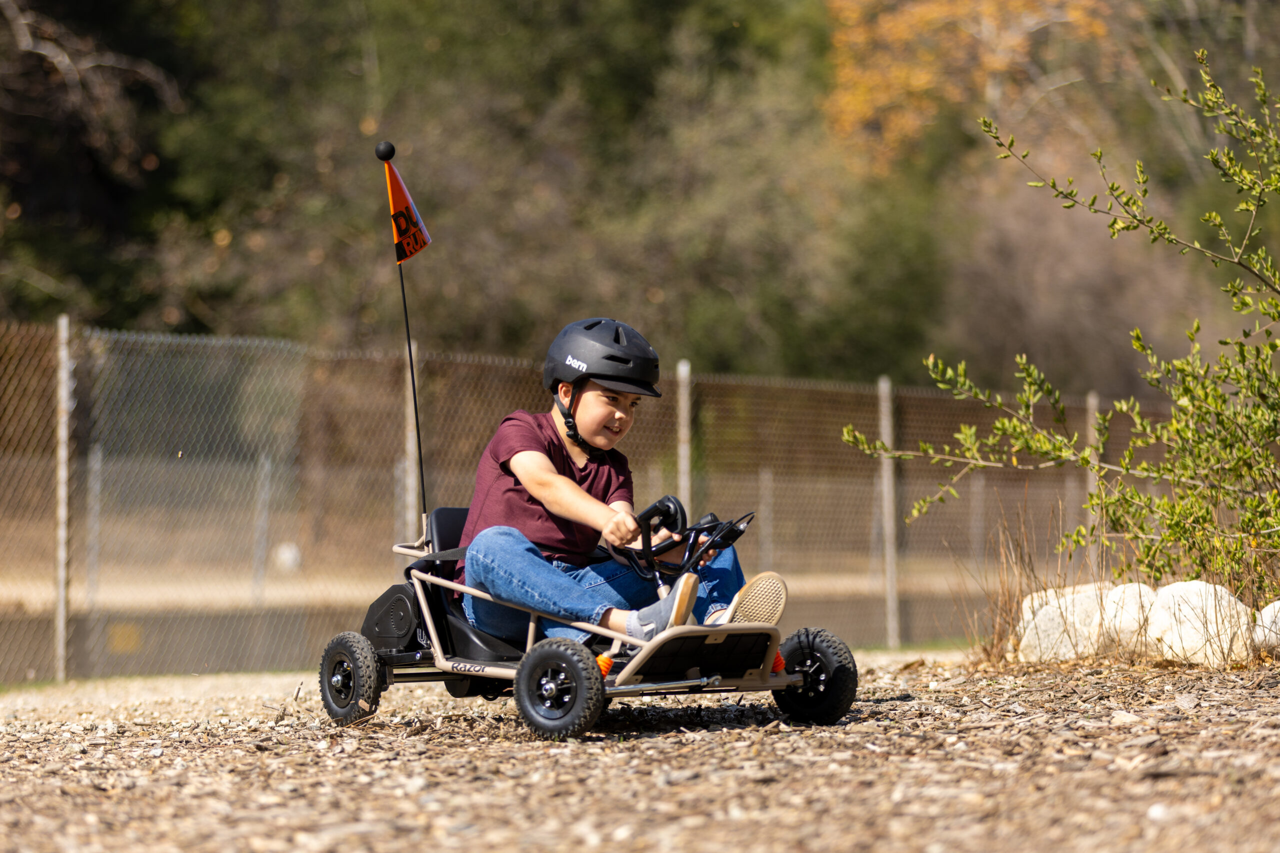 - Kid-friendly, steering wheel-mounted throttle and hand-operated rear disc braking system