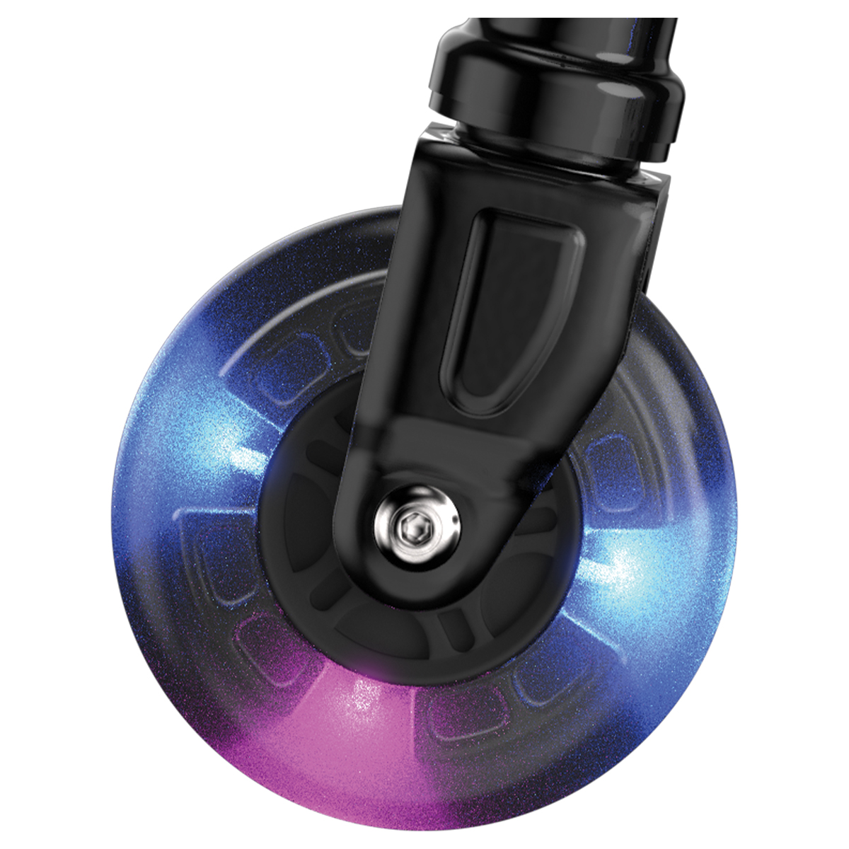 Multi-color light-up front wheel and LED light bar on the sides of the deck will illuminate when the scooter is in motion. No Battery Required!
