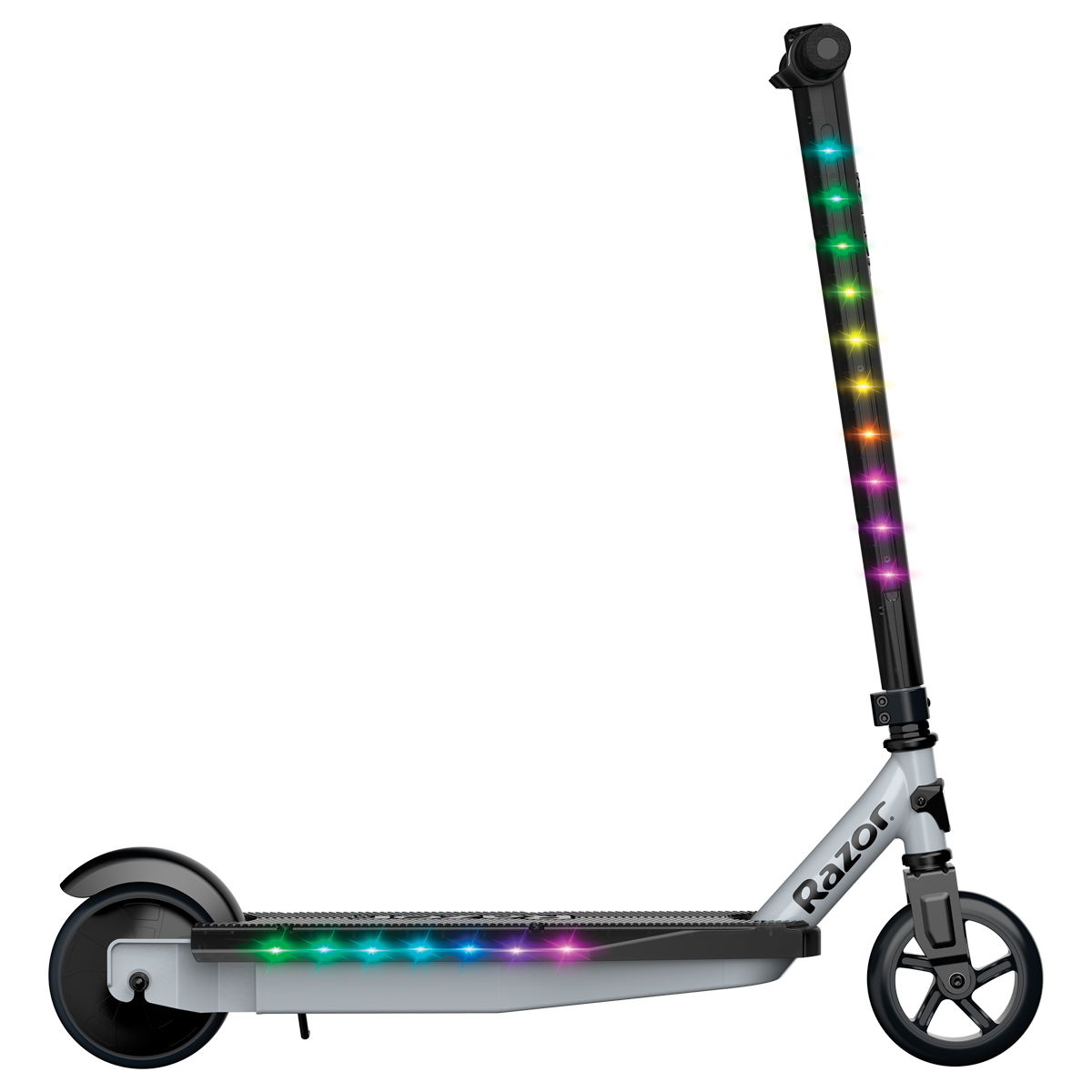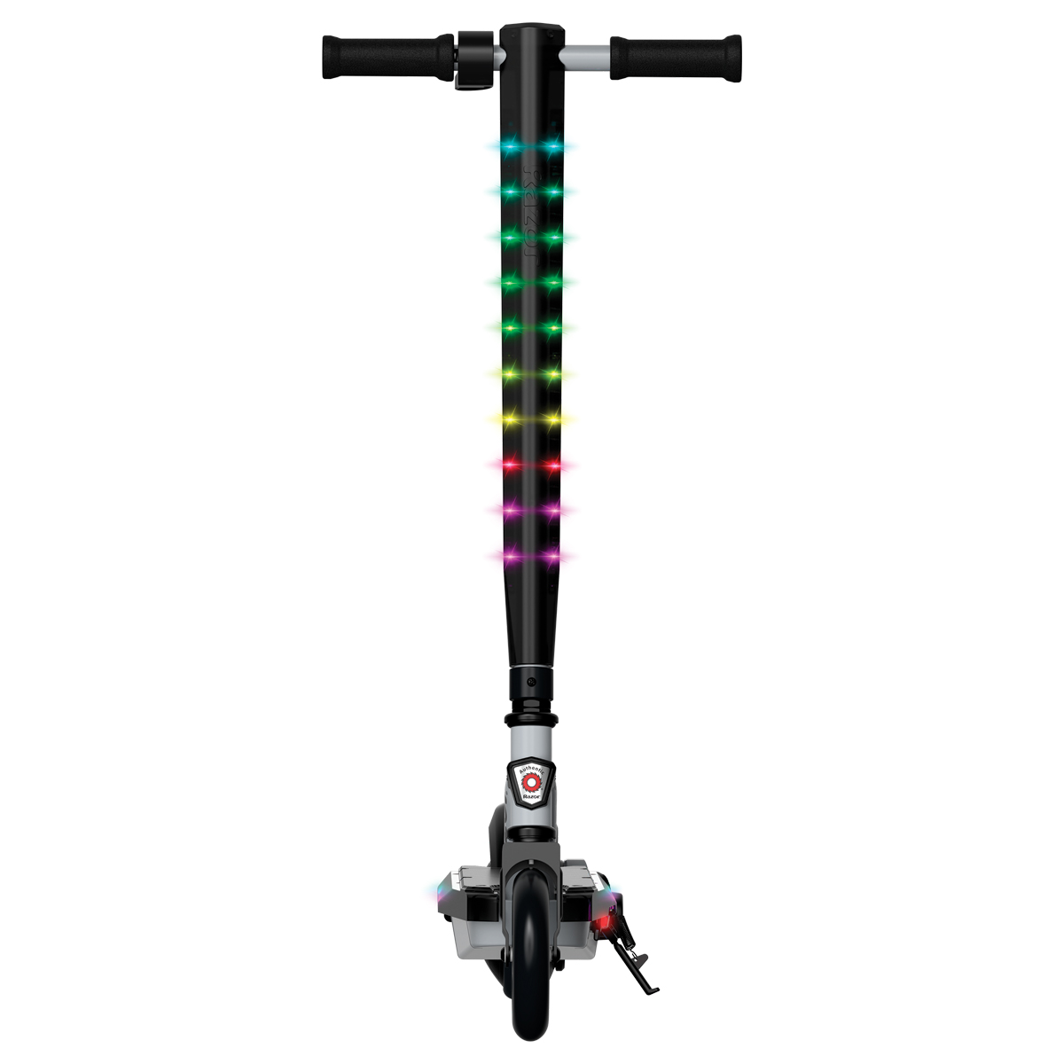 Powering on the product using the ON/OFF switch will activate the multi-color LED lights embedded along both sides of the deck and steering tube.