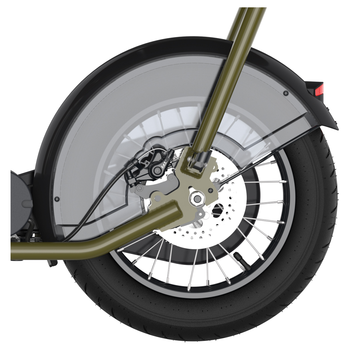 - Wheels: Spoked, 16″ (406 mm) with superwide pneumatic tires