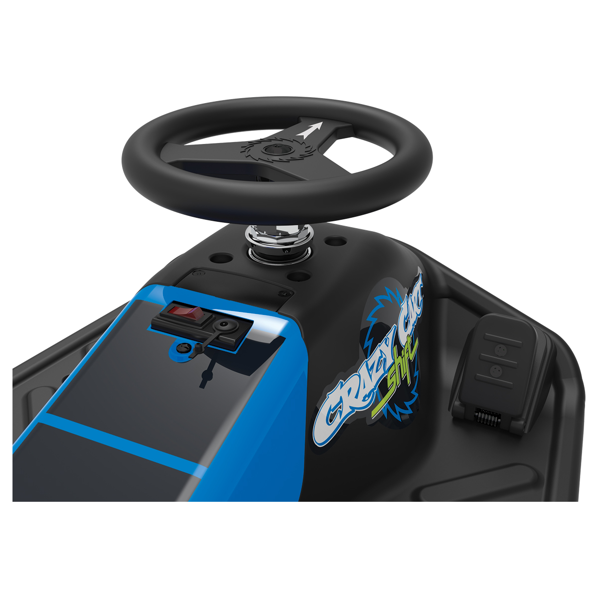 A hidden top speed control switch allows parents to select the appropriate maximum speed for their child: 2.5 mph (4 km/h) for beginners and younger drivers or 8 mph (13 km/h) for the full Crazy Cart Shift experience.