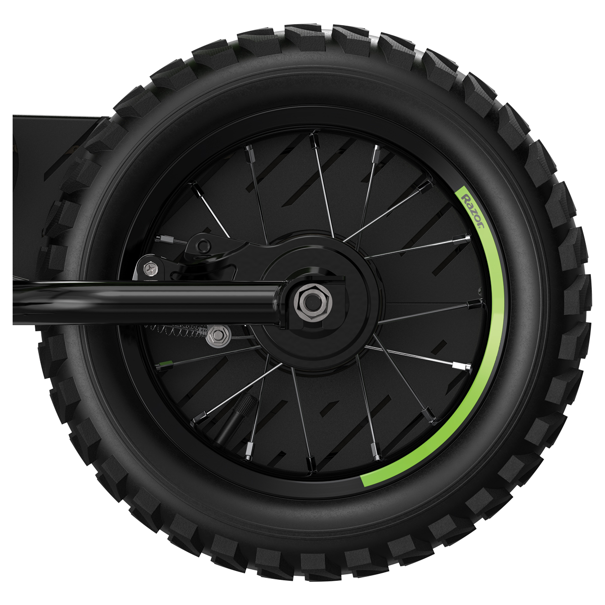 - Wheels: Spoked with custom black rims and 12” (305 mm) rubber, pneumatic tires