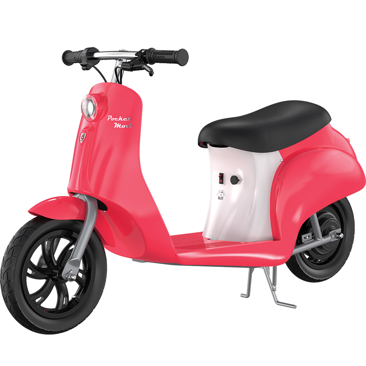 - With its padded seat, twist-grip throttle control, and hand-operated brake, the Pocket Mod is a scaled-down European scooter that looks and feels like the real thing.