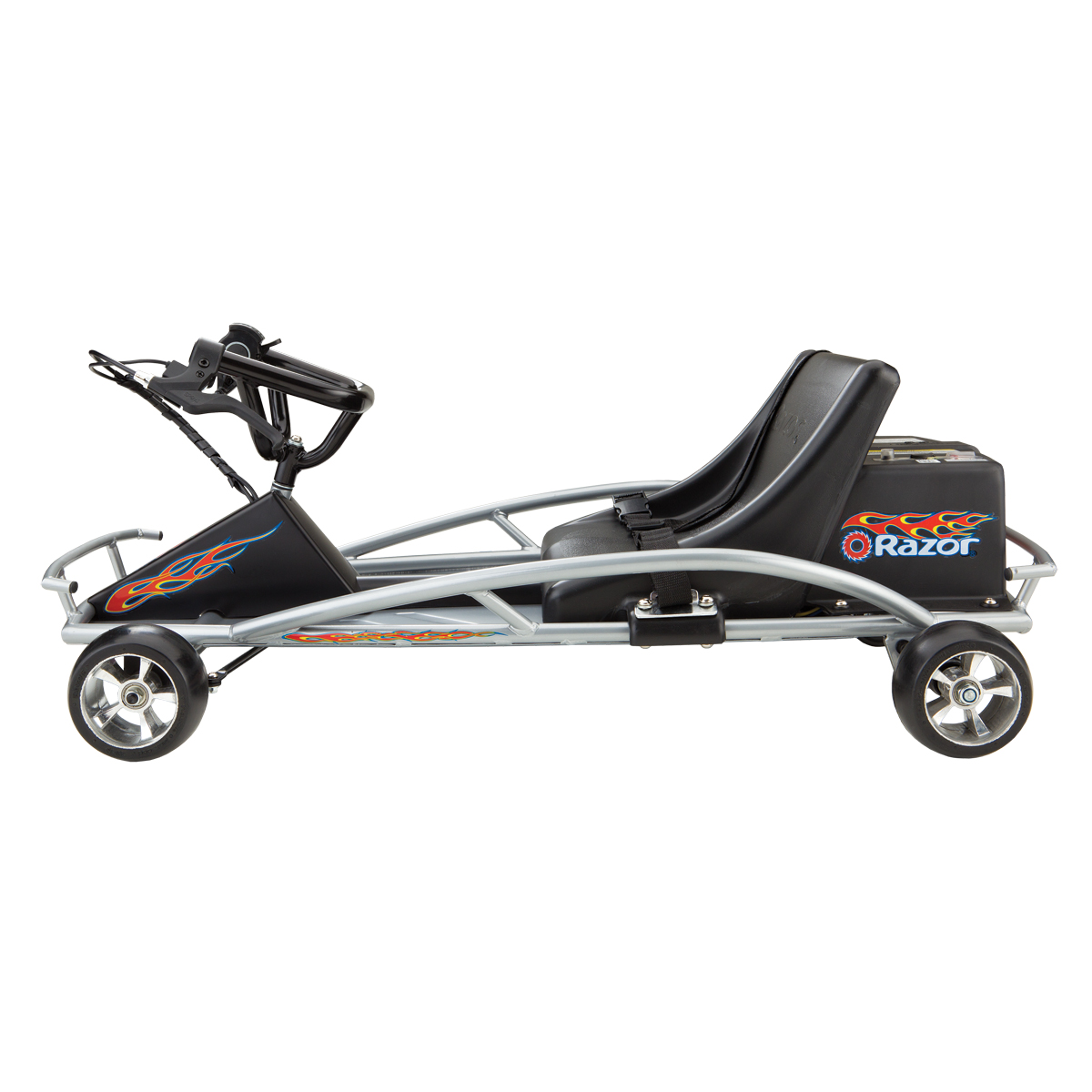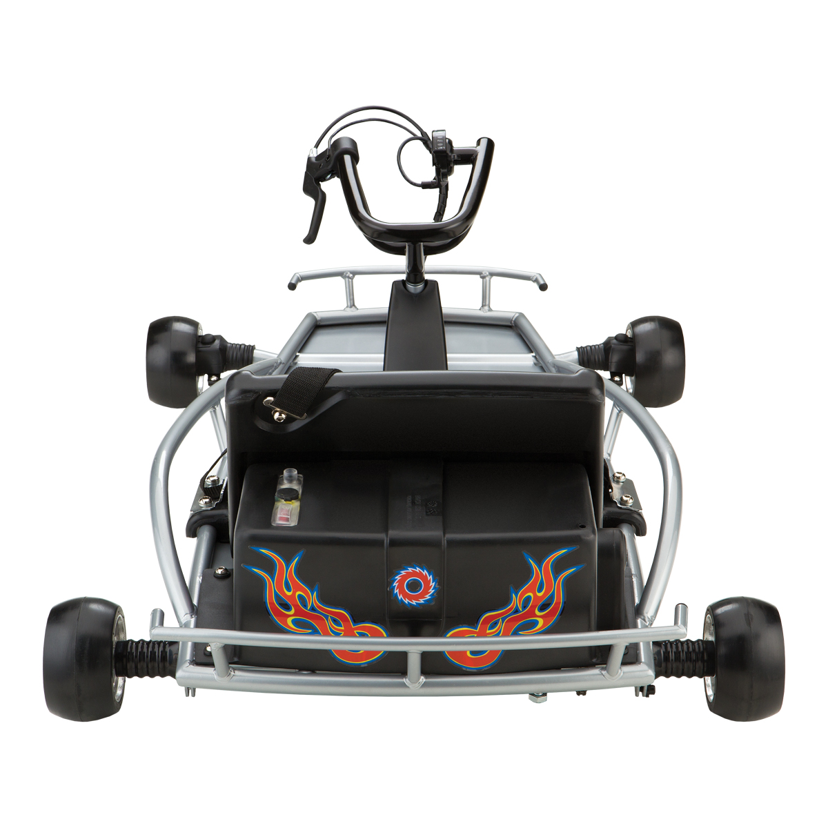 Designed for zipping around flat trails or a cul-de-sac (local laws apply), this electric go-kart features rubber tires with molded aluminum rims, bucket-style seat with shoulder strap, hand-operated rear brake, and rechargeable 24-volt battery system that delivers up to 40 minutes of continuous run time.