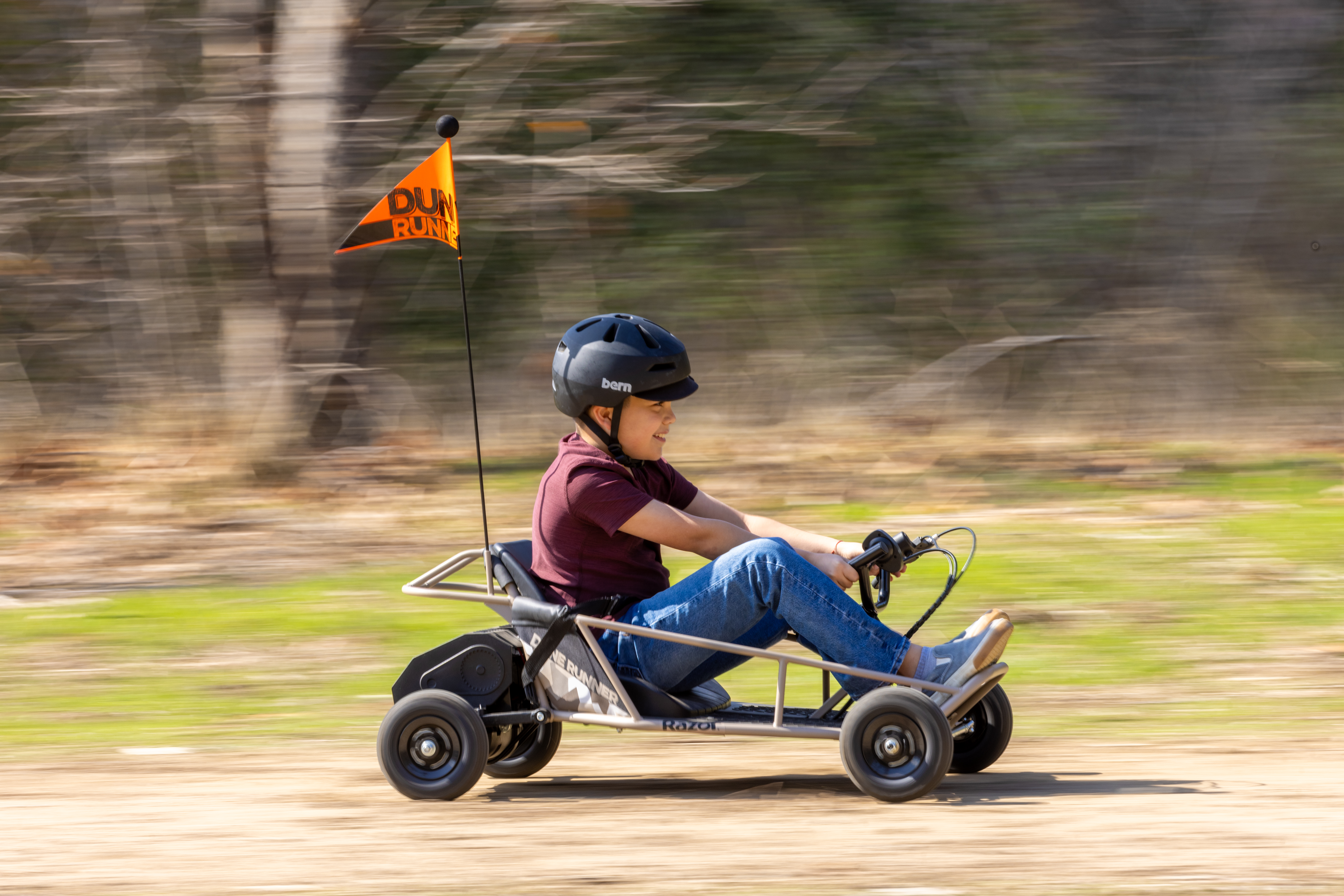 - Kid-friendly, steering wheel-mounted throttle and hand-operated rear disc braking system